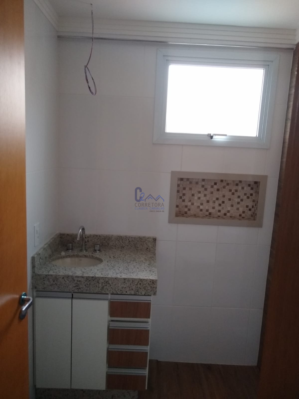 Um banheiro social com gabinete;