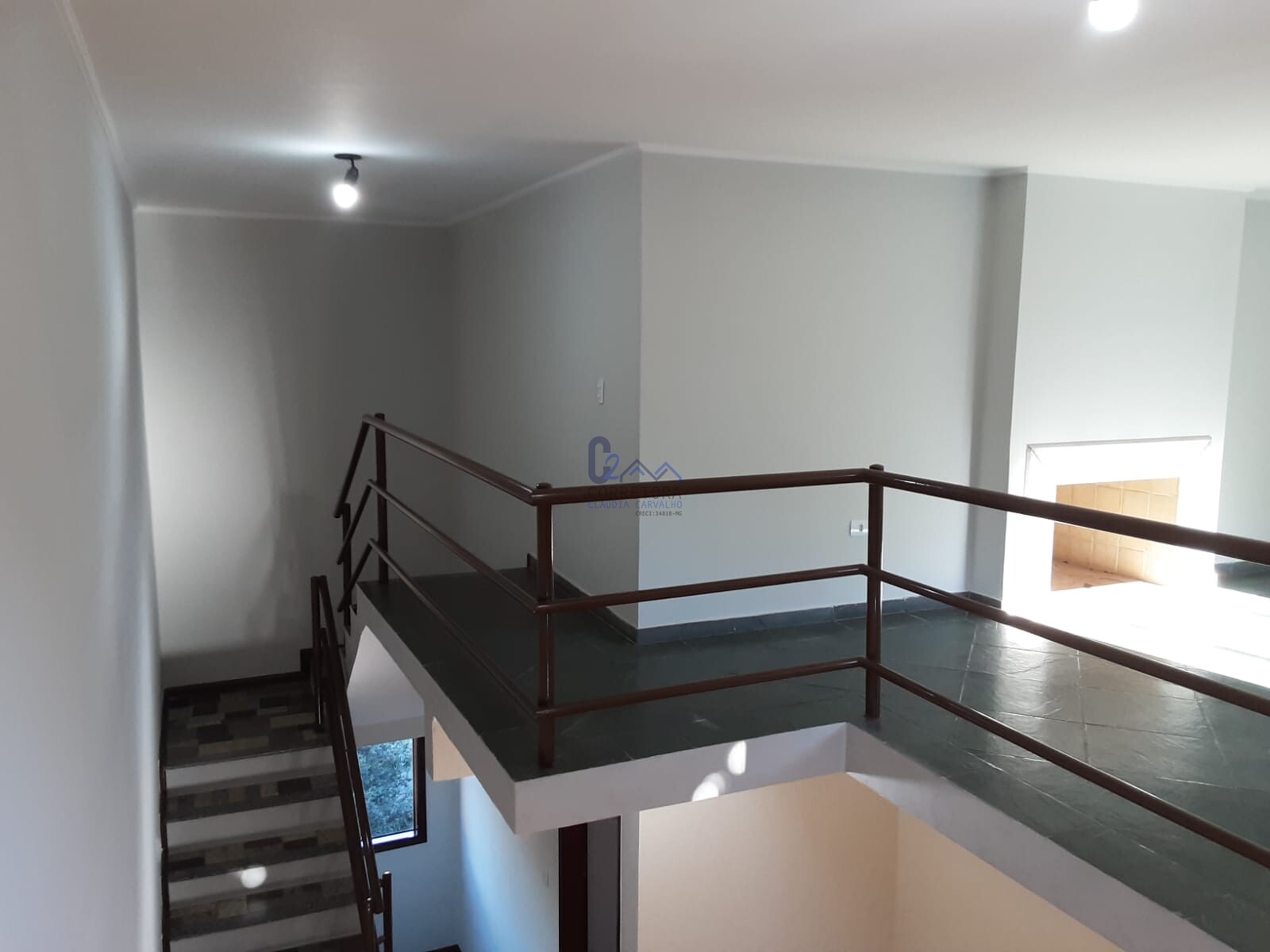 Casa principal, com três quartos, sendo uma suíte com varanda e armário, banheiro social, cozinha ampla e sala de jantar; no andar superior tem uma grande sala de estar com lareira.