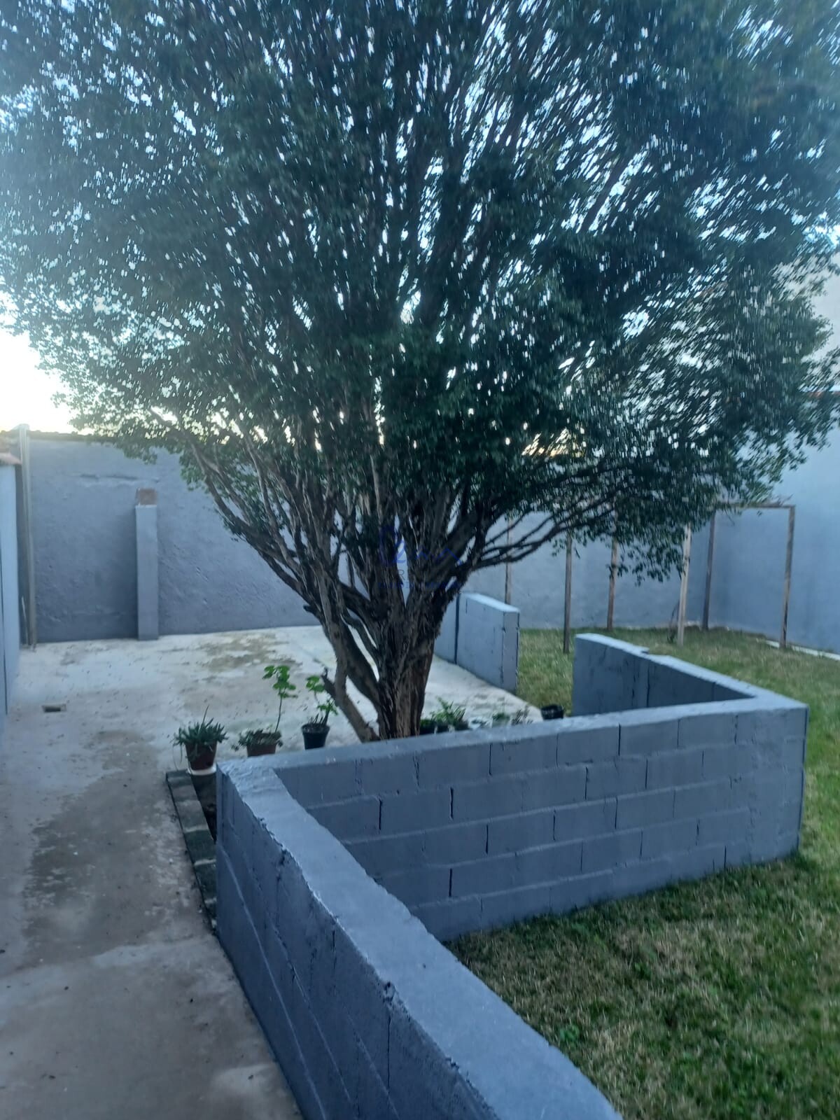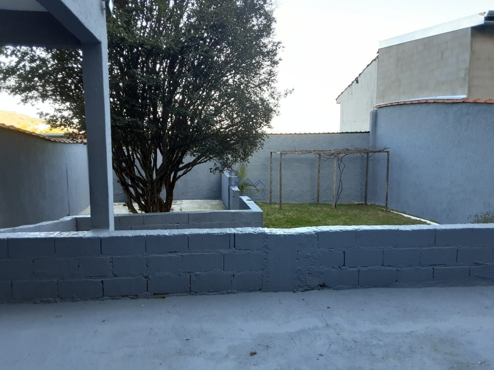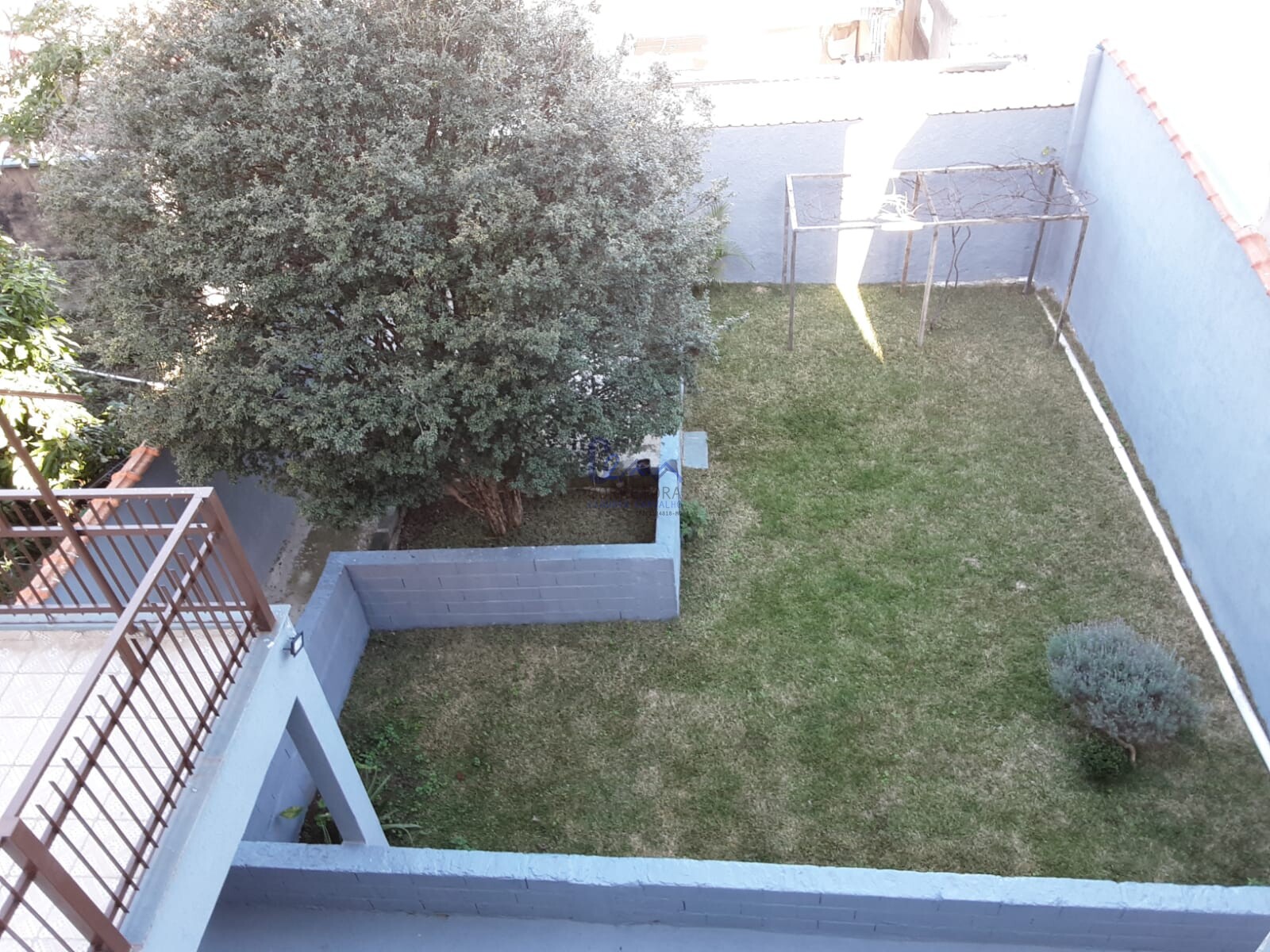 Quintal bem grande com uma parte dele gramado, tem jabuticabeira , videiras e flores.