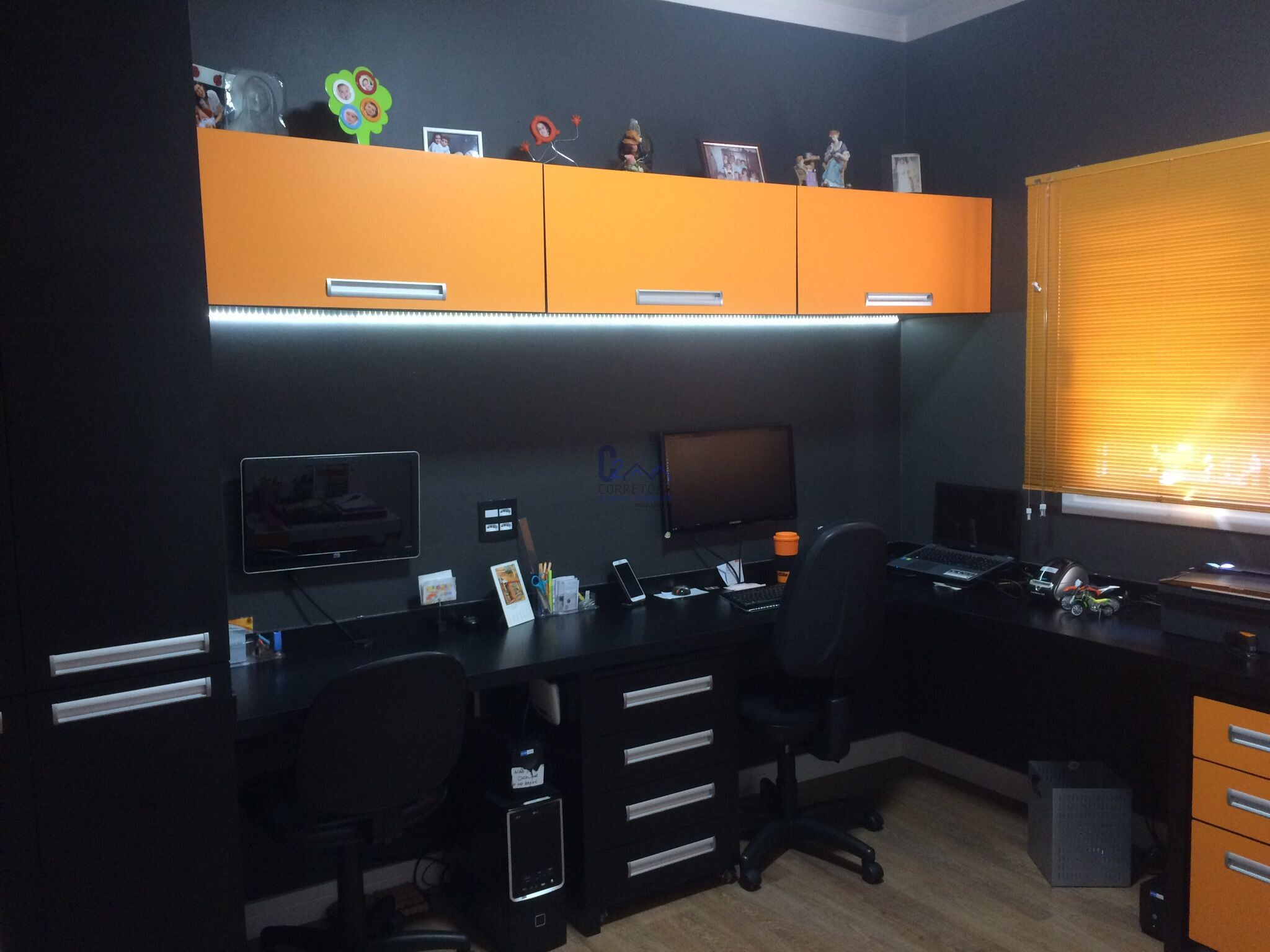 Cômodo extra para sala de jogos ou oficina (com armários planejados, bancada de serviço, tanque, porta externa)