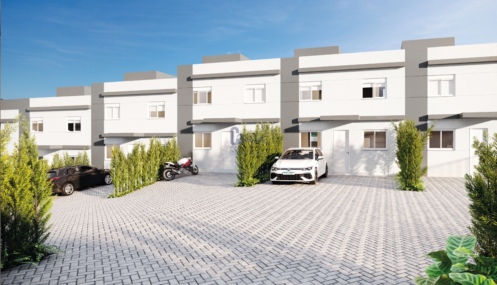 São 28 casas de 68m², com duas suítes, cozinha, sala para dois ambientes, banheiro social , área de serviço e garagem para dois carros.