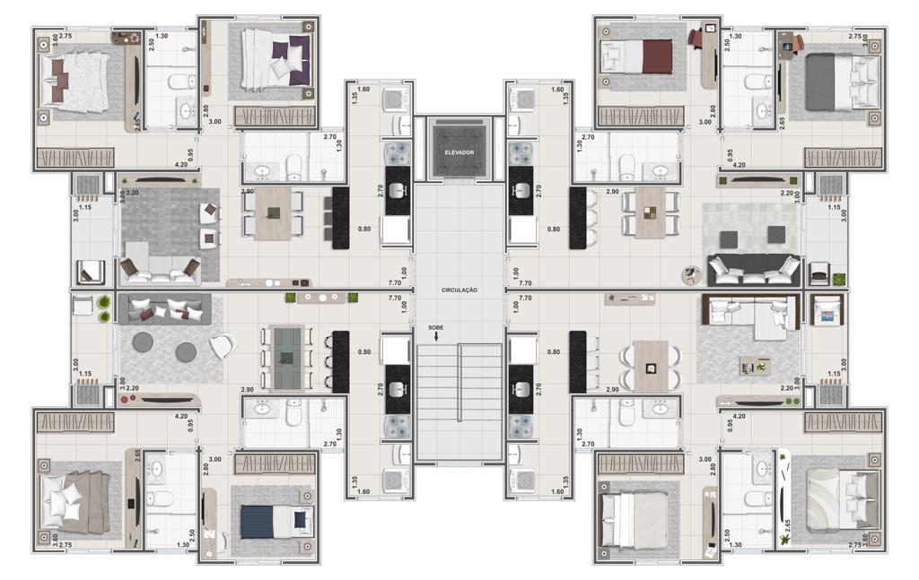 Pavimento Tipo: será composto por 04 (quatro) apartamentos, elevador e escada.