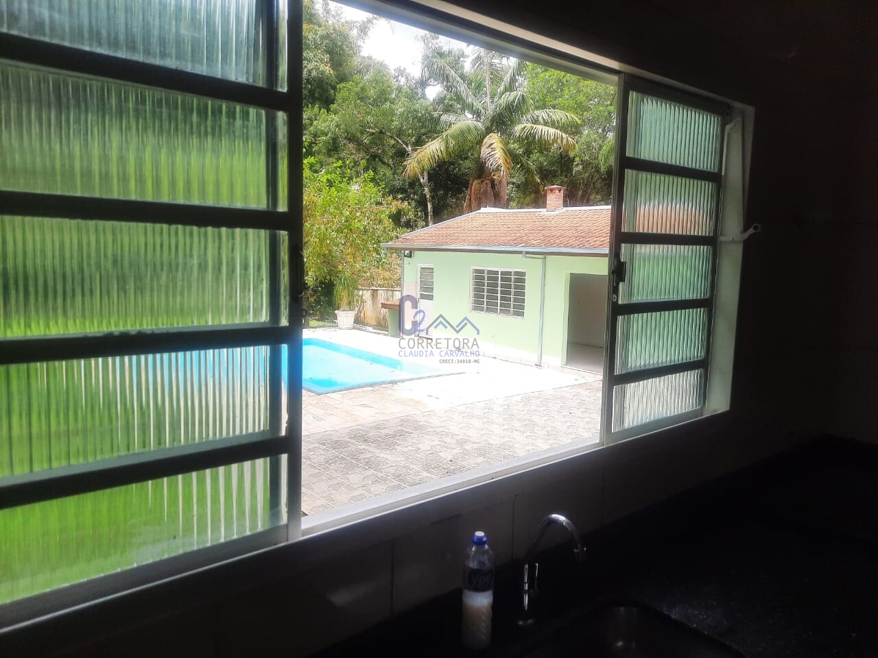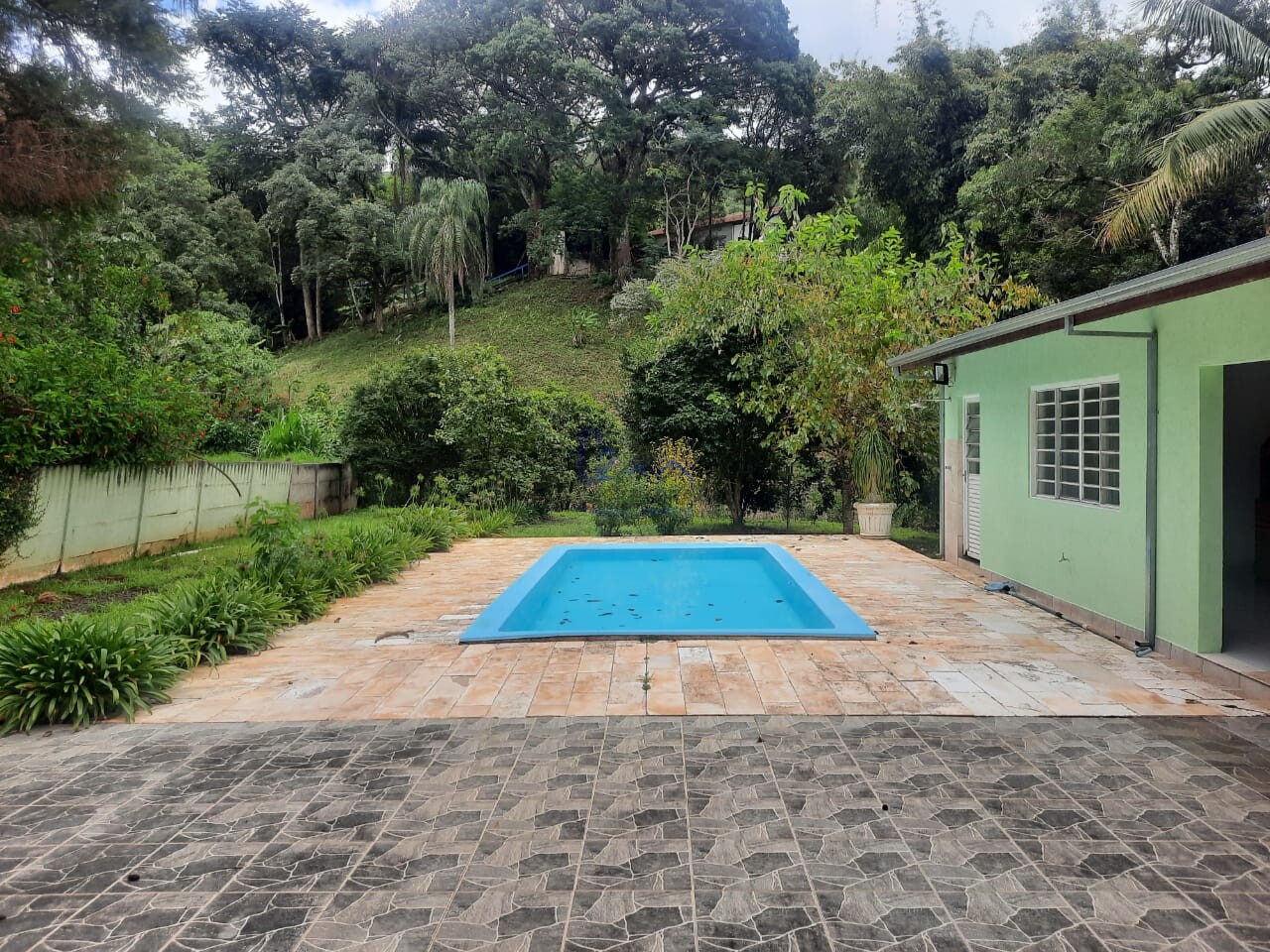 Área de lazer com: piscina, chuveirão e edicula com churrasqueira;