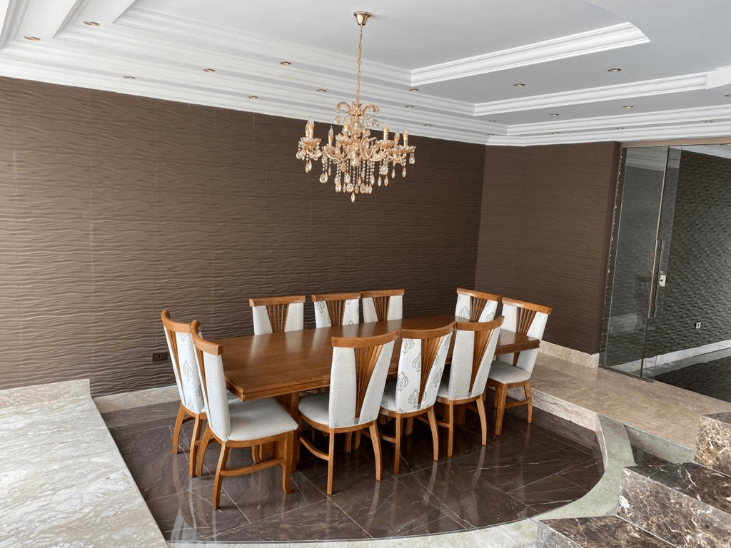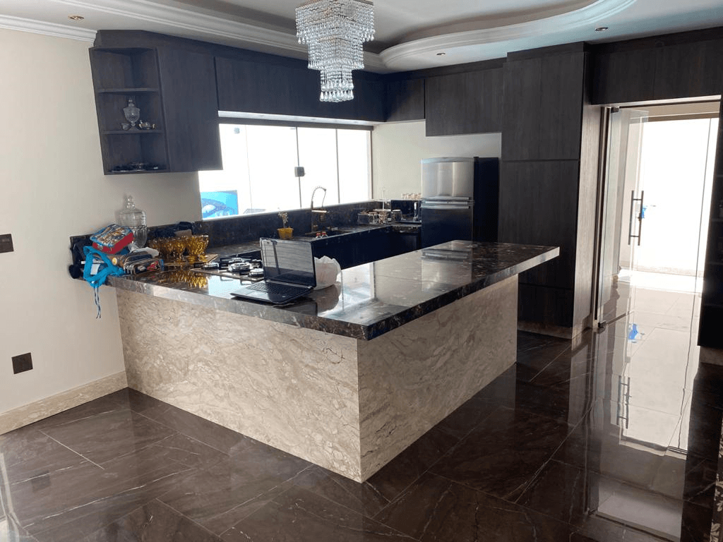 - Uma cozinha grande toda em mármore Imperador e mármore Travertino;
