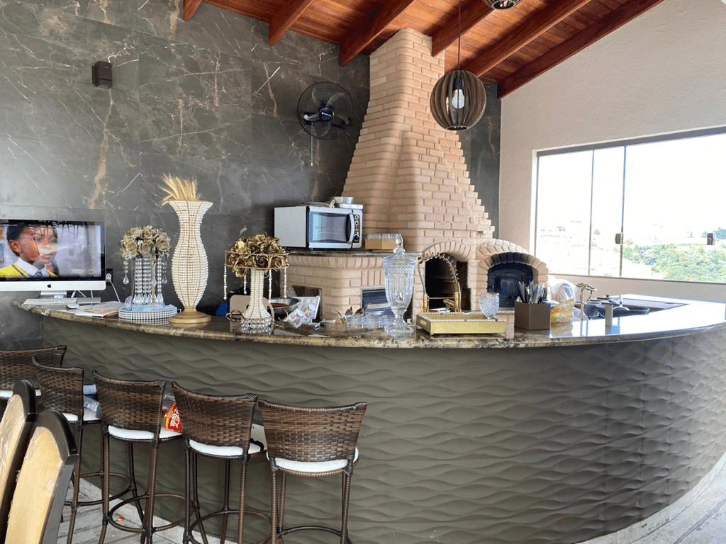 - Cozinha na área externa, próxima à piscina com